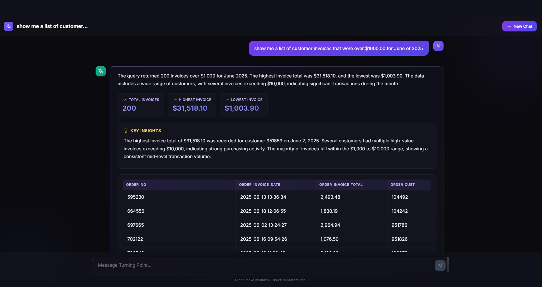 From question to insight in seconds. Our AI analyzed 119 invoices, identified margin patterns, and flagged issues - all from one simple English question.